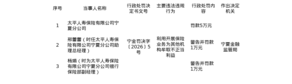 针对这一溜为,国度金融监督搞定总局宁夏监管分局对其罚金5万元;对时任太平东谈主寿保障有限公司宁夏分公司助理总司理的邢蕾蕾、银行保障部副司理的杨娟,鉴识劝诫并处罚金1万元。